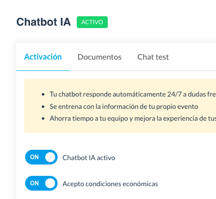 ¿Has comprobado las respuestas y crees que hace un buen trabajo? Es el momento de activar tu chatbot. En la pestaña de Activación tienes las condiciones económicas. Acepta las condiciones y pulsa en "Chatbto IA activo" = ON.