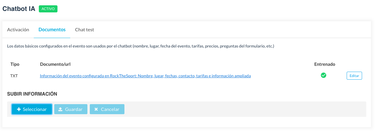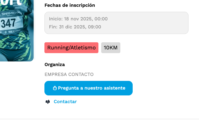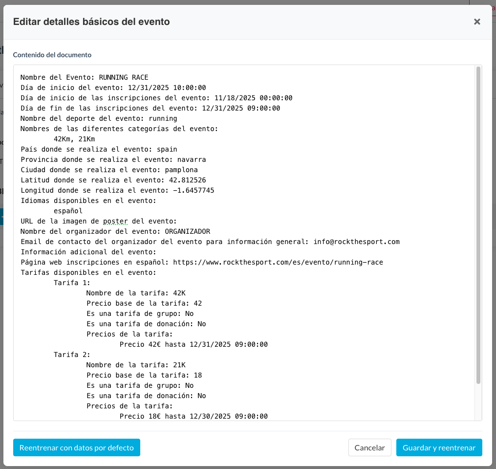 La forma más rápida de empezar es entrenarlo con la información básica configurada en RockTheSport: nombre del evento, lugar, fechas, contacto, tarifas e información ampliada.