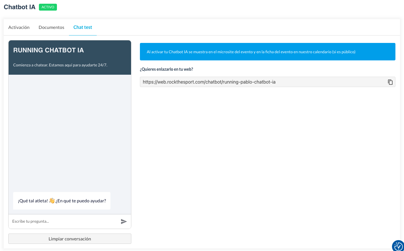Antes de activar tu chatbot puedes probarlo en la pestaña "Chat test". Realiza las preguntas que pueden hacer tus participantes y comprueba las respuestas. Puede ser el momento de ajustar la documentación para mejorar sus respuestas.