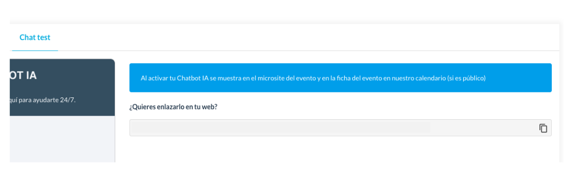¿Quieres incluirlo en tu web? Copia la dirección de tu chatbot IA y usála como un link/botón a tu gusto en tu página. Lo puedes hacer desde la configuración, pestaña "Chat test"