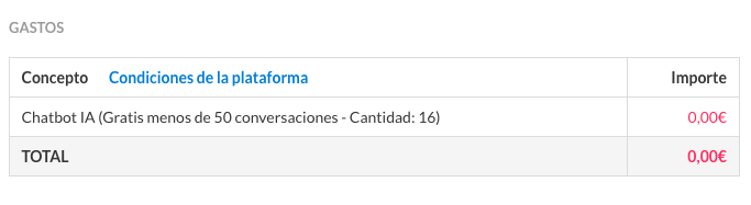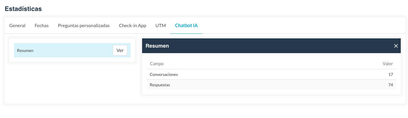 Puedes consultarlo en el menú Resumen / Estadísticas / Chatbot IA: