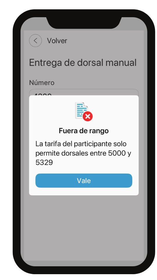 Si el voluntario entrega por error un dorsal que corresponde a otra tarifa, saltará una alarma.