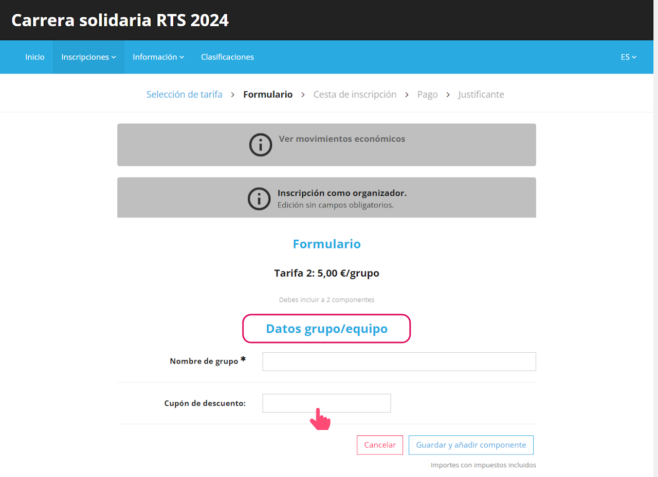 Si se ha configurado un pecio grupal se creará un solo cupón para todo el grupo con el descuento y el sistema lo descontará automáticamente. El campo cupón descuento aparecerá en la cabecera de grupo.