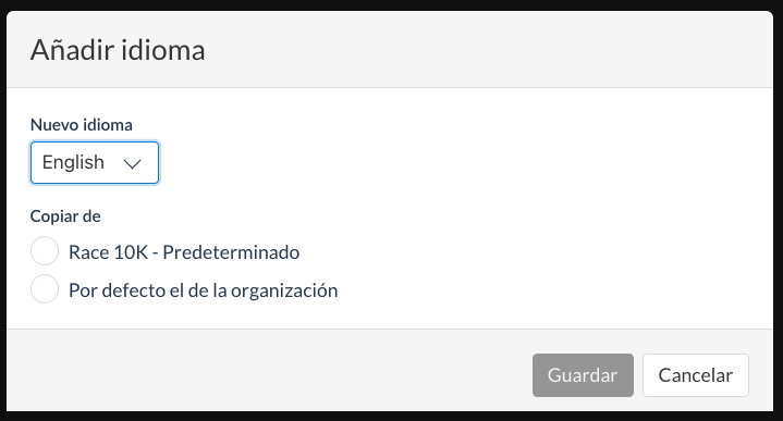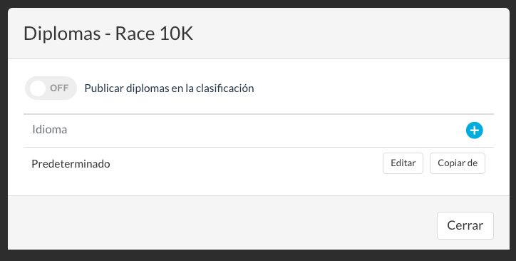 Cada clasificación tiene un diseño con idioma "Predeterminado" que se generará independentemente del idioma en el que visiten los usuarios las clasificaciones. Si tu evento permite ver el microsite en diferentes idiomas, también puedes configurar los diplomas en estos mismos idiomas.