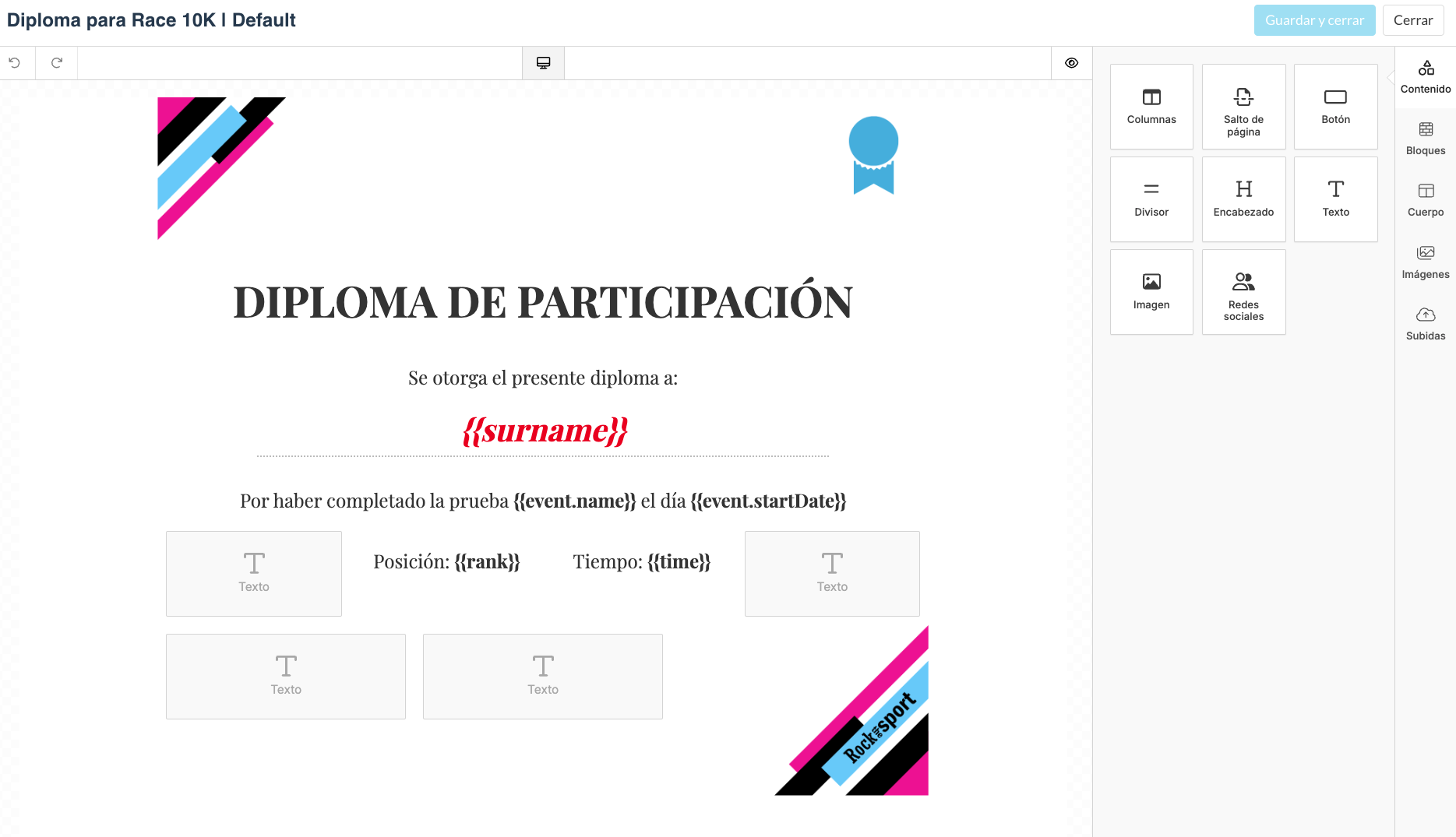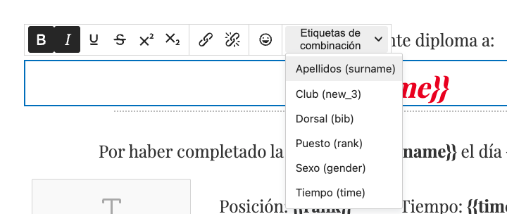 Los contenidos tipo Encabezado y Texto puedes editar sobre el mismo y se mostrará una barra de formato. En esta barra tendrás disponible tus etiquetas de combinación, que serán todos los campos que has subido a tu clasificación desde el fichero excel. Algunos de ellos son estándar (surname, bib, rank.etc) y otros serán campos como Nueva propiedad que has indicado previamente.