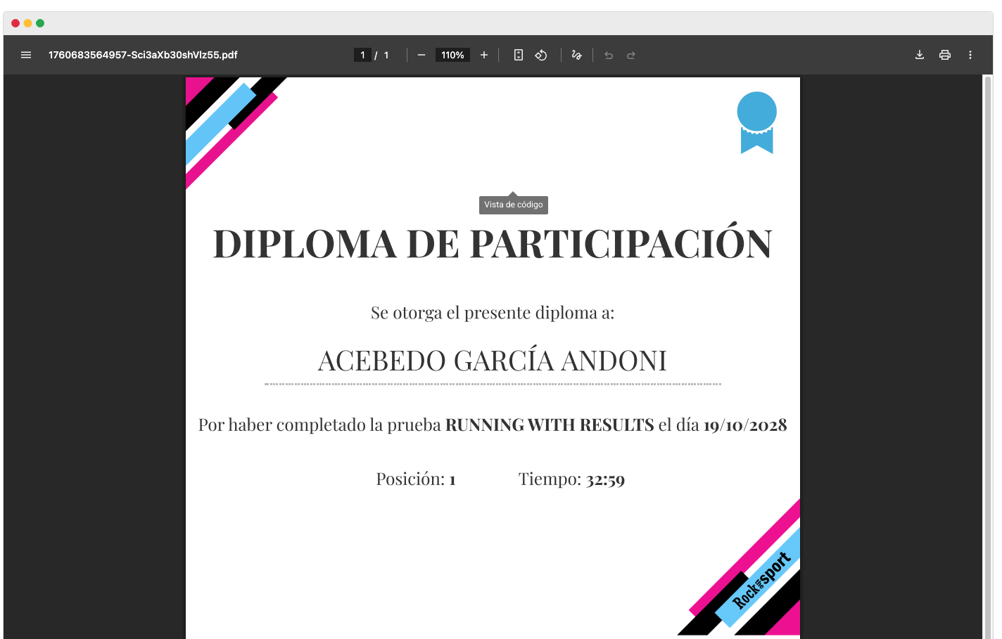 En clasificaciones de tipo individual y equipos puedes configurar los diplomas para tus participantes.