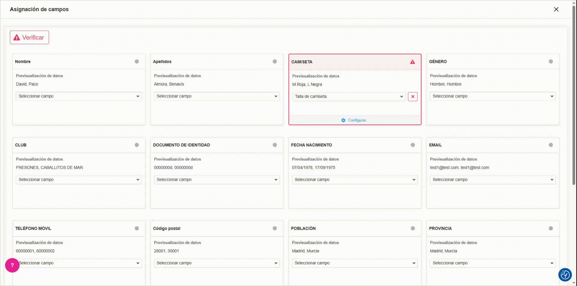 Para relacionar las tallas de camiseta, se pone a funcionar directamente sin necesidad de hacer nada (lo que llamamos automapeo). En caso de que la asiganción automática no sea correcta, se puede modificar manualmente.