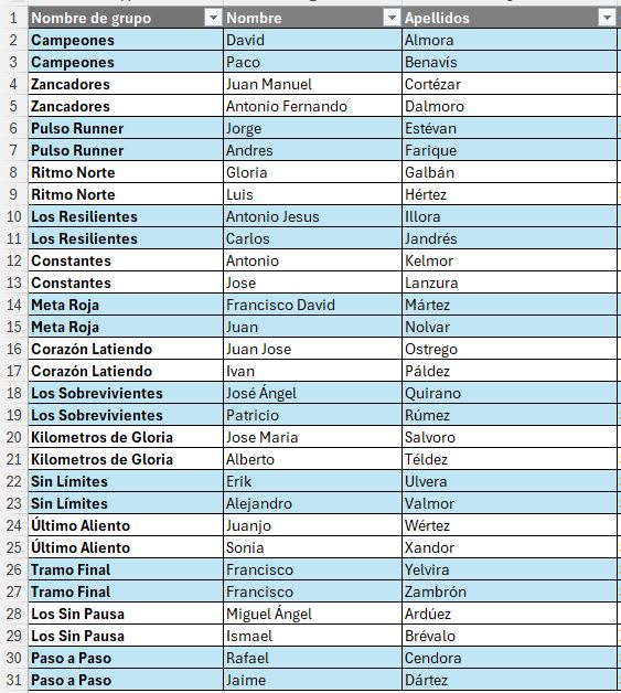 En la imagen se observa que cada pareja tiene asignado un nombre de grupo. Este nombre debe ser único y obligatorio para todos los registros.