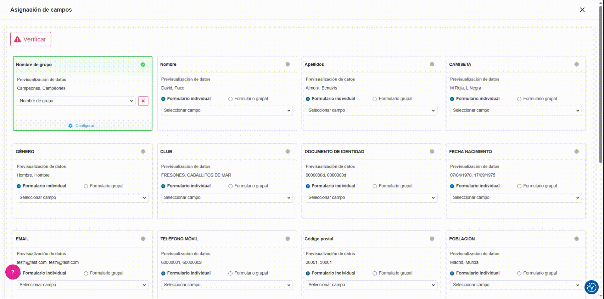Primeramente, es importante asignar el mismo nombre de grupo a cada componente de ese equipo. La plataforma utiliza esta información para identificar correctamente cada grupo y aplicar posteriormente la asignación de campos.