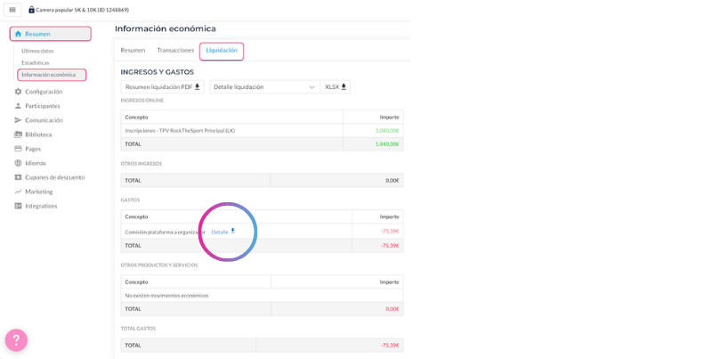 El apartado de liquidación incluye todos los ingresos y gastos generados en tu evento. De forma global puedes ver el total de ingresos recaudados en el evento.