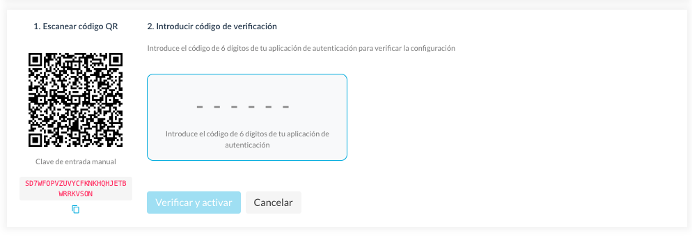 Tras escanear el código la app habrá generado un código que deberás indicar y pulsar en "Verificar y activar".