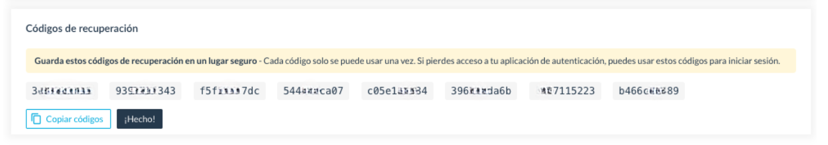 Una vez activado te mostrará unos códigos que te permitirán iniciar sesión si has perdido la app de autenticación o tengas algún problema con tu dispositivo. Guárdalos en un lugar seguro.