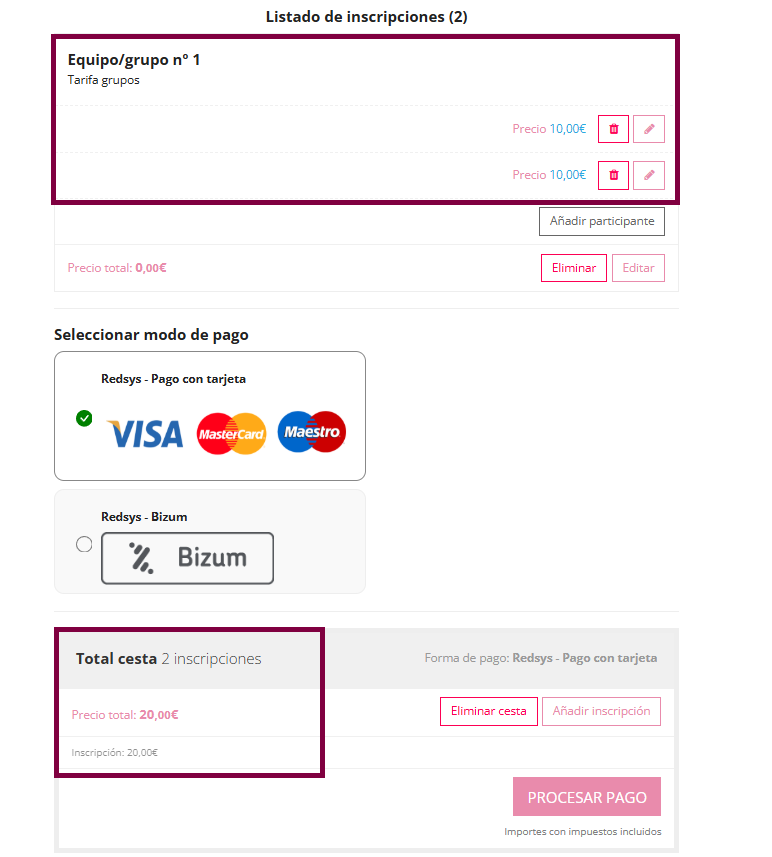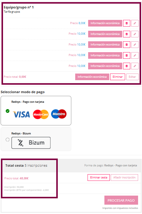 En este caso la inscripción del equipo es de 5 personas , por lo que se aplica el descuento de 2 € que hemos configurado anteriormente. El descuento se aplica a una de las personas inscritas del grupo.