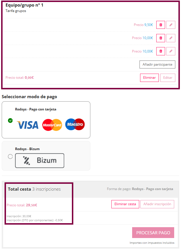 En el siguiente caso vemos un equipo de 3 personas en la que sí se realiza el descuento de 0,50€ como hemos configurado anteriormente. El descuento se aplica a una de las personas inscritas del grupo.