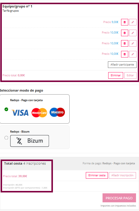En este caso la inscripción del equipo es de 4 personas , por lo que se aplica el descuento de 1 € que hemos configurado anteriormente. El descuento se aplica a una de las personas inscritas del grupo.