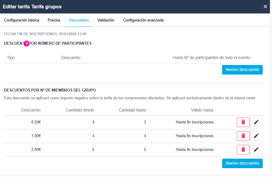 En este ejemplo el precio es de 10€, está configurado para que si son tres personas en el grupo haya un descuento de 0,50€, si son cuatro personas en el grupo, que el descuento sea de 1€ y si son cinco personas en el grupo el descuento sea de 2€.